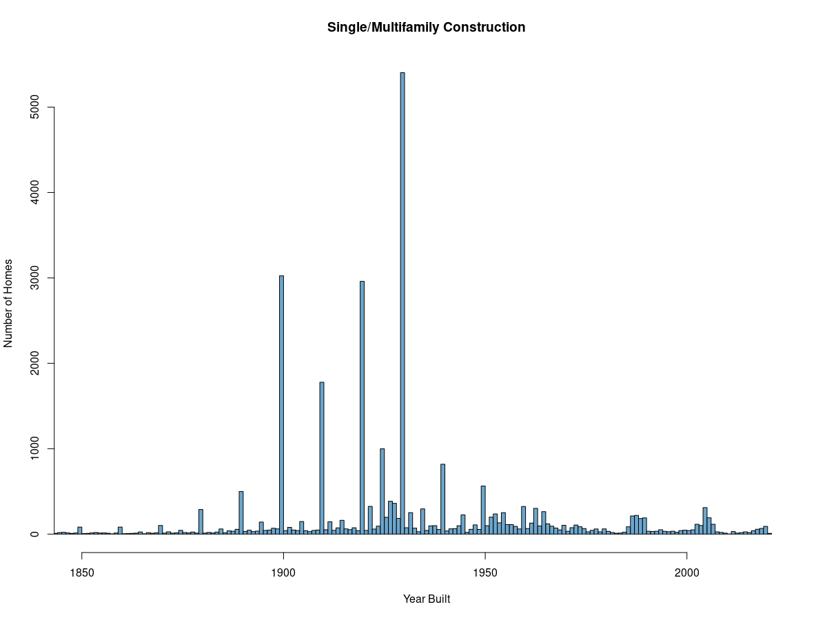 As is to be expected, pretty old. Most of the homes were built in 1930 (5,403), and 90% of them were built before 1978, meaning that they very likely have lead paint. So don't feel too bad that your house has lead. Almost everyone else's does, too!