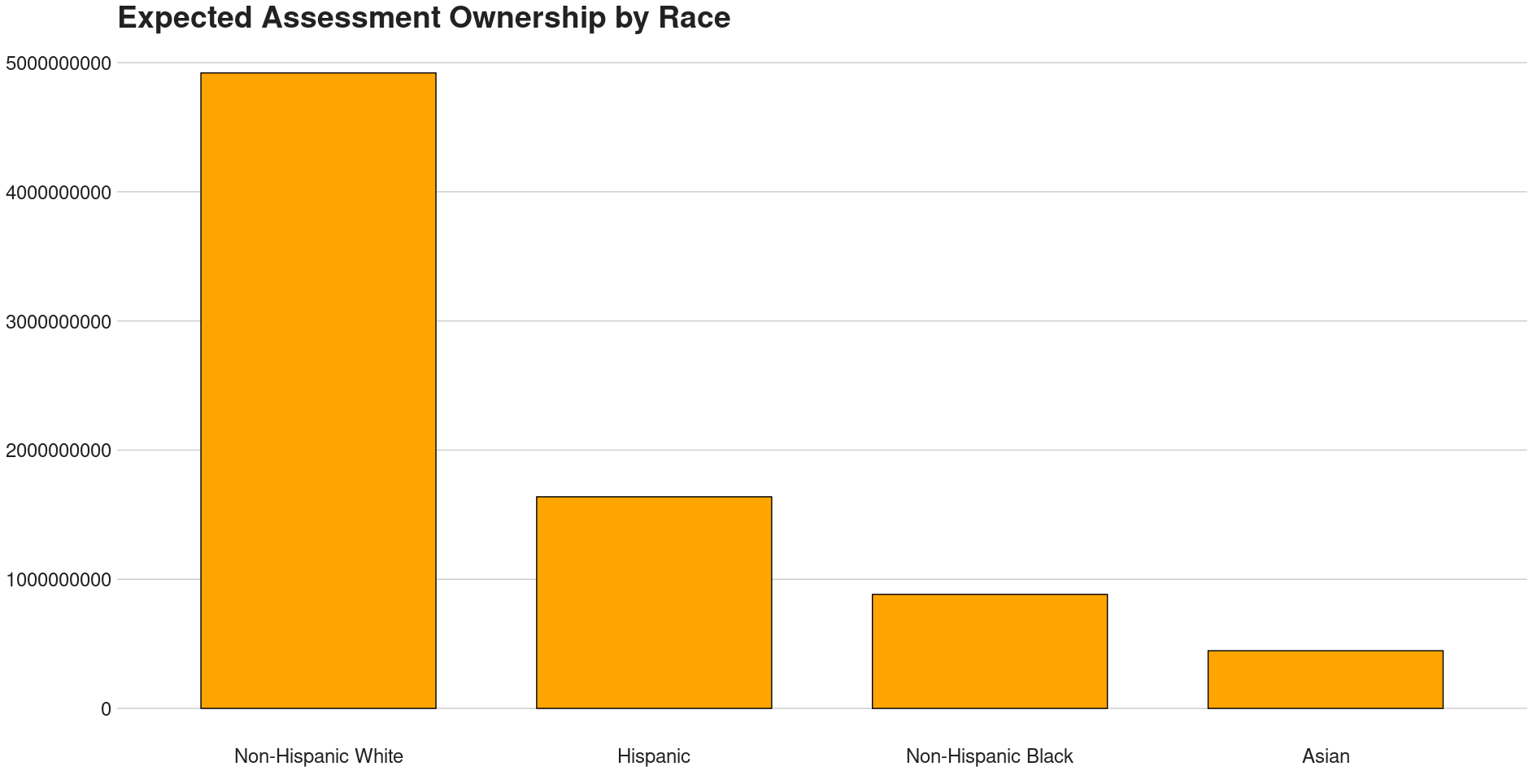 How much of the city's property wealth do white people own? One way to estimate this would be to calculate the expected monetary value for each property. Suppose that a property is worth $500,000 and our model believes the owner has a 90% chance of being Non-Hispanic White. Then we can calculate the Non-Hispanic White's assessment "share" as 500,000*0.90 for $450,000, with $50,000 divided among the other categories. Of course property values are not divvied up like this. A Non-Hispanic White person cannot own 90% of a home, in most circumstances. But expected value, especially across a large sample like here (over 30,000 residential properties), should be more or less useful, provided that the underlying name guessing model works.