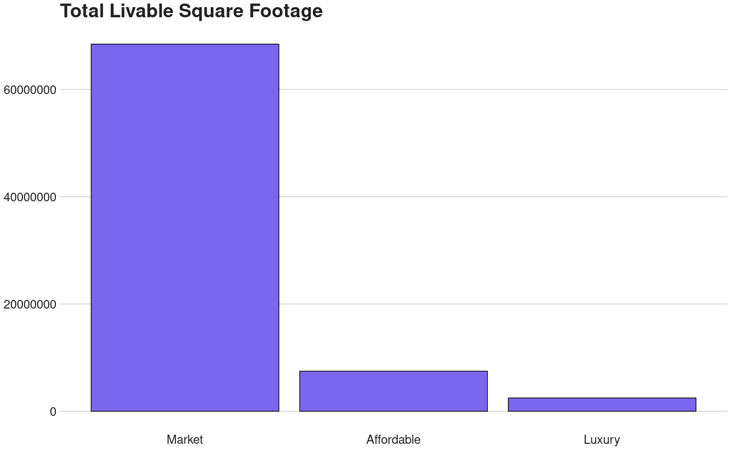 Acreage doesn't much account for density; build a high-rise apartment on an acre and you certainly have much more living space than single family homes on five acres. So, I lumped square footage into the categories of affordable, luxury, and market value housing. I only included a property as "luxury" if it was advertised in some way as a luxury complex (apartments or condos), not if it was just really expensive.