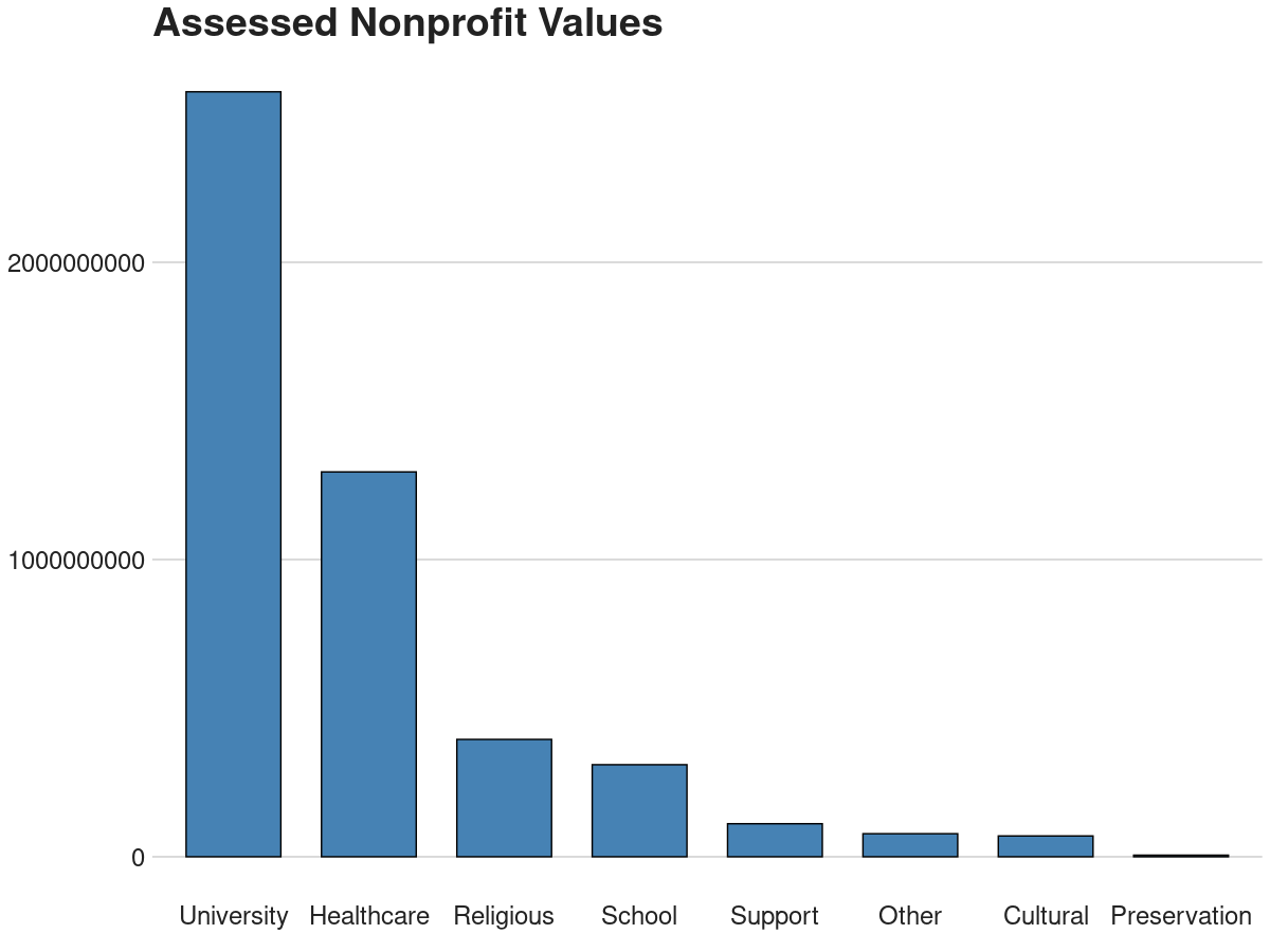 I really don't have much to add to the conversation here, but if I didn't comment on nonprofit space then I'd be remiss. Nonprofit space accounts for 748 acres, of which 386 are classified as university property. The total assessed value of nonprofits is $4.83 billion, with universities making the largest share, as seen below.