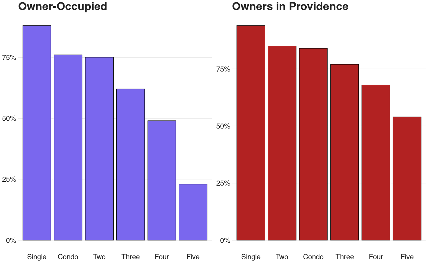 I compared the addresses of each property with that of its owner, and indicated that it was not owner-occupied when the streets did not match, on the assumption that some multifamilies have different numbers despite being the same property. Below is the percentage of owner-occupied homes by category as well as the percentage of owners who live in Providence.