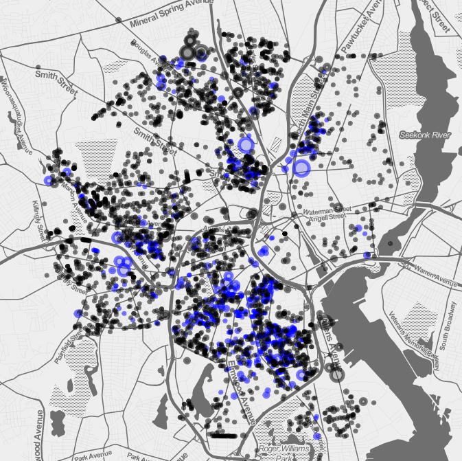 I scraped all of Providence's assessment data as found on its Vision page and then mapped the results here, finding that whites are more likely to own homes (especially single families and condominiums), that racial ownership is geographical, that we have far more vacant land than affordable housing, and that property wealth is concentrated on the East Side. These are all fairly predictable outcomes but arresting when visualized.